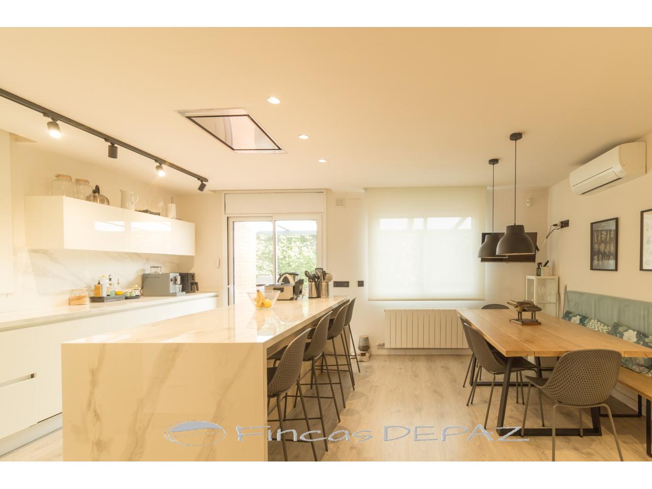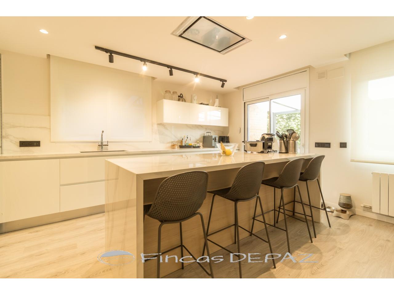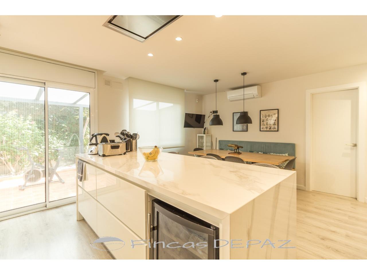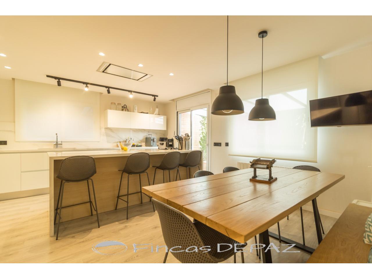 En planta principal disponemos de un amplio salón comedor con grandes ventanales y salida directa a jardín, preciosa cocina de diseño y excelentes acabados (comunicada a salón y con salida directa a jardín/terraza), una estancia amplia diáfana con uso polivalente ( actualmente con uso de oficina), y un aseo de cortesía.
